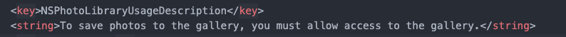 때문에 key를 NSPhotoLibaryUsageDescription를 추가하였고, string에 설명을 늘어적었다. (한글로도 된다고 하던데 나는 그냥 안전하게 영어로 썼다.)
