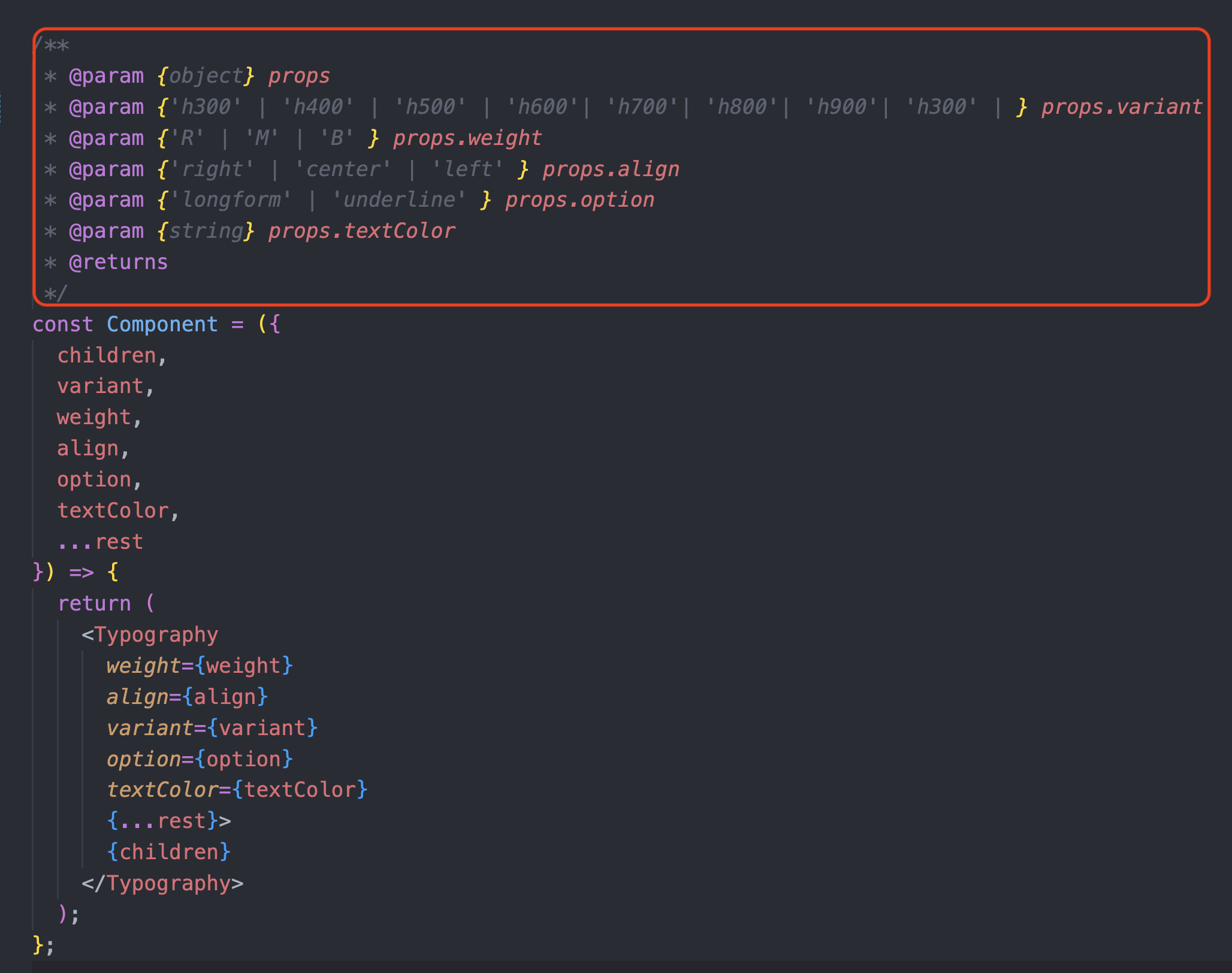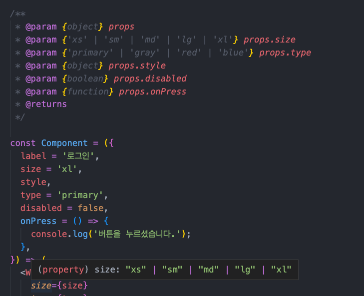 빨간 박스 안에 있는 부분이 JSDoc입니다.
