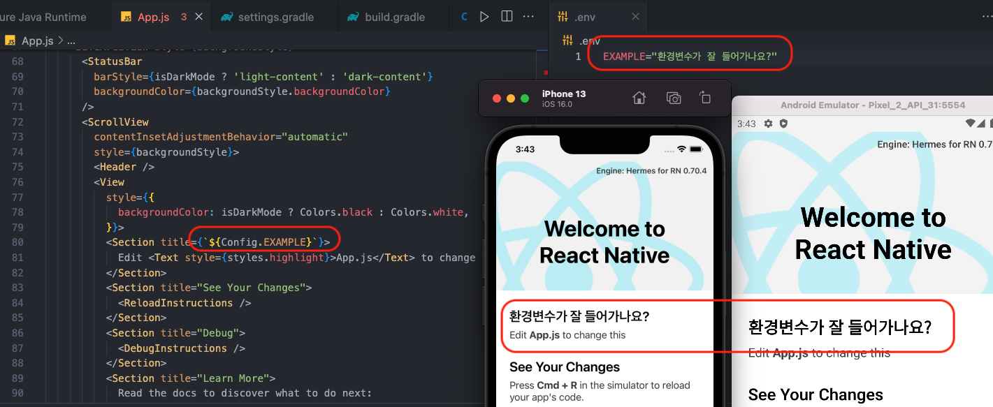 React와는 다르게 .env를 생성하고 네이티브단과 연동하는 작업이 필요합니다.