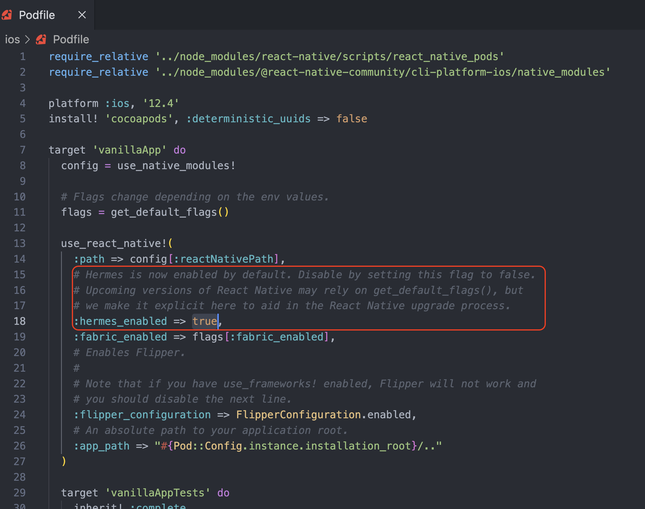 나같은 경우는 hermes 관련 에러가 일어났는데, Podfile을 보면...