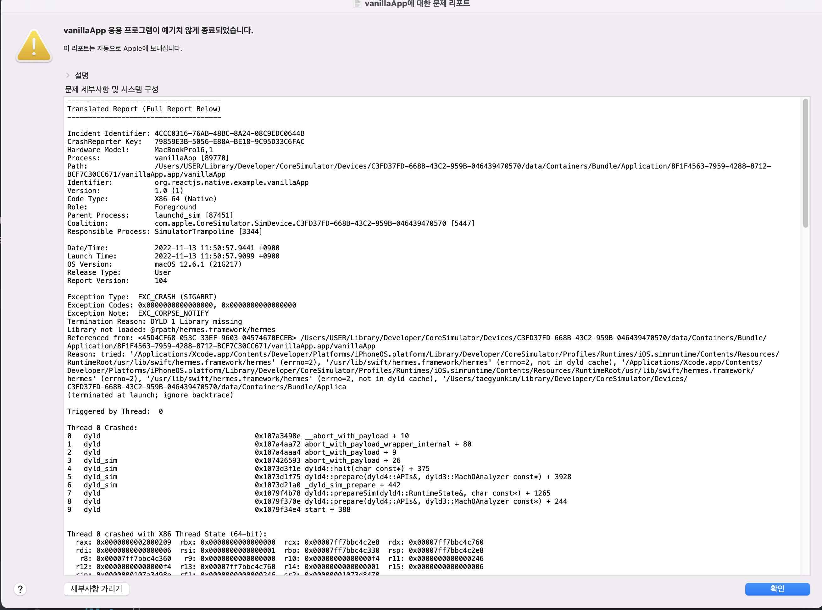 이런 식으로 네이티브 단에서 크러쉬 리포트를 뿜어내며 앱이 튕긴다.