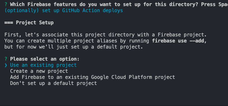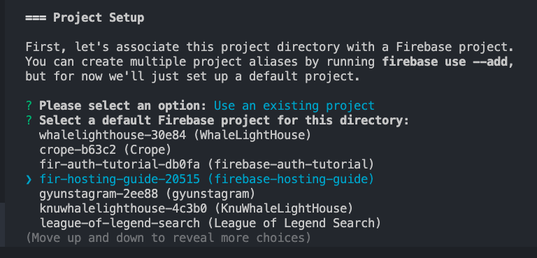 이미 firebase 프로젝트를 생성하였기 때문에, "Use an existing project"에 포커스한 뒤 엔터를 한다.