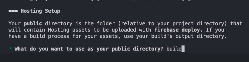 그 다음은 업로드 될 파일을 명시하라고 한다. 기본 입력지가 public으로 나올건데 public으로 절대 하지 말고, 같은 루트 파일에 build 폴더를 생성한 뒤에 아래 스크린샷처럼 "build"를 입력하고 엔터를 친다.