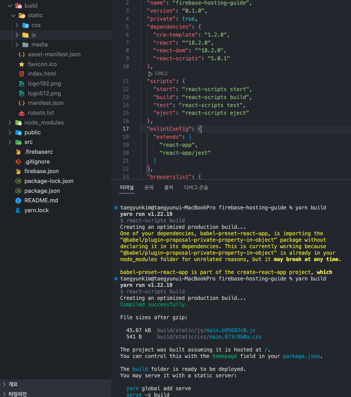 해당 명령어를 실행(yarn build)해주면 build 파일에 프로젝트를 구성하는 모든 소스파일들이 묶이게 된다.