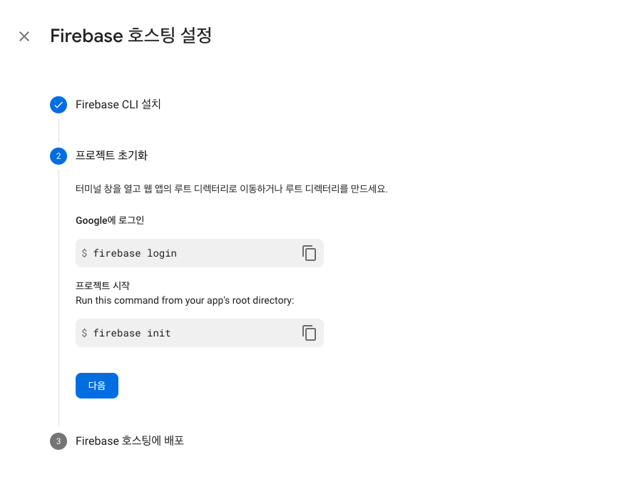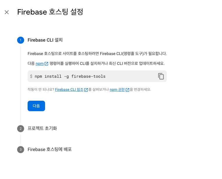 가이드대로 터미널에서 "npm install -g firebase-tools" 명령어를 실행하여, 곧 Firebase CLI를 전역으로 설치해주고, "다음" 버튼을 클릭한다.