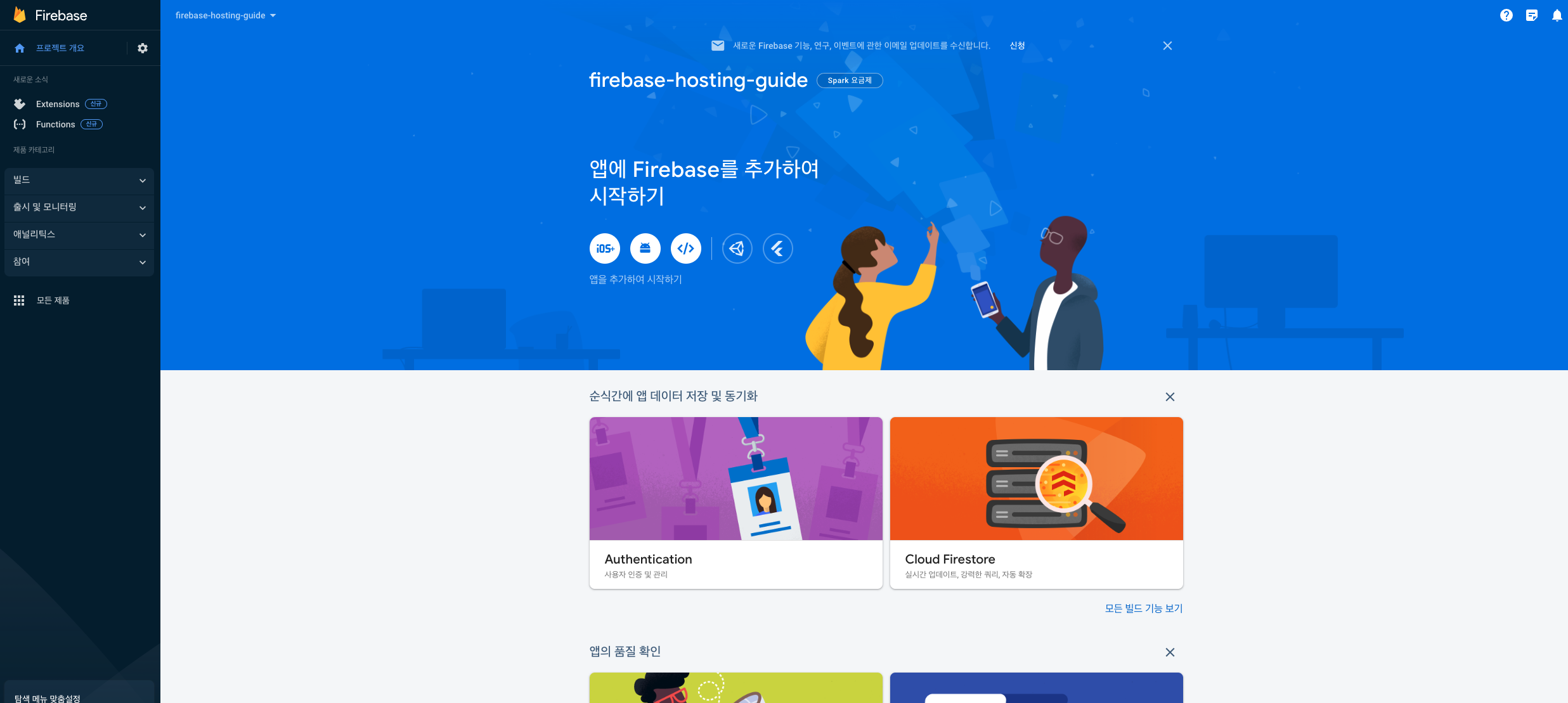 파이어베이스에서 제공하는 많은 기능들이 있지만, 모두 번외로 하고 자신이 만든 프로젝트를 실서버(URL)에 등록(호스팅)만 하는 방법에 대해 알아보자.