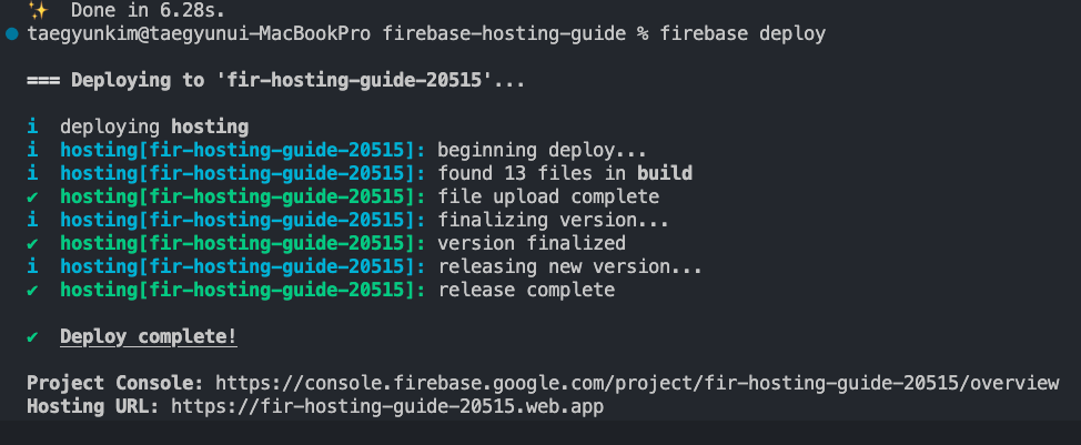 build까지 완료가 되었다면 build에 묶여있는 소스코드를 연결된 firebase 프로젝트로 올리는 명령어만 치면 배포가 완료된다.