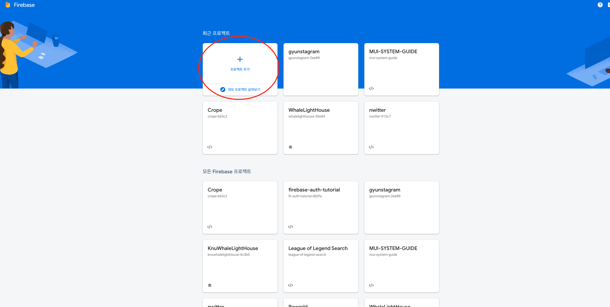 "프로젝트 추가" 영역을 클릭하여 파이어베이스의 새로운 프로젝트를 추가할 준비를 한다.