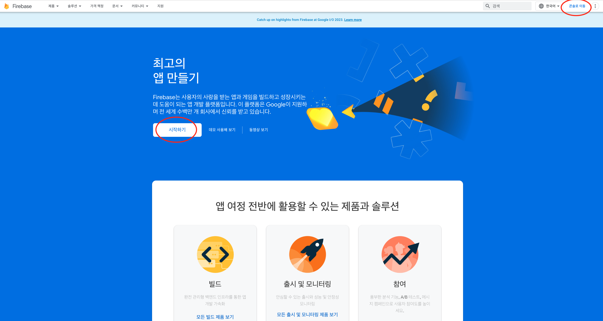 파이어베이스에 접속(상단 링크 참고)하여 "시작하기" 또는 "콘솔로 이동" 버튼을 클릭하여 다음 스텝으로 진행한다.