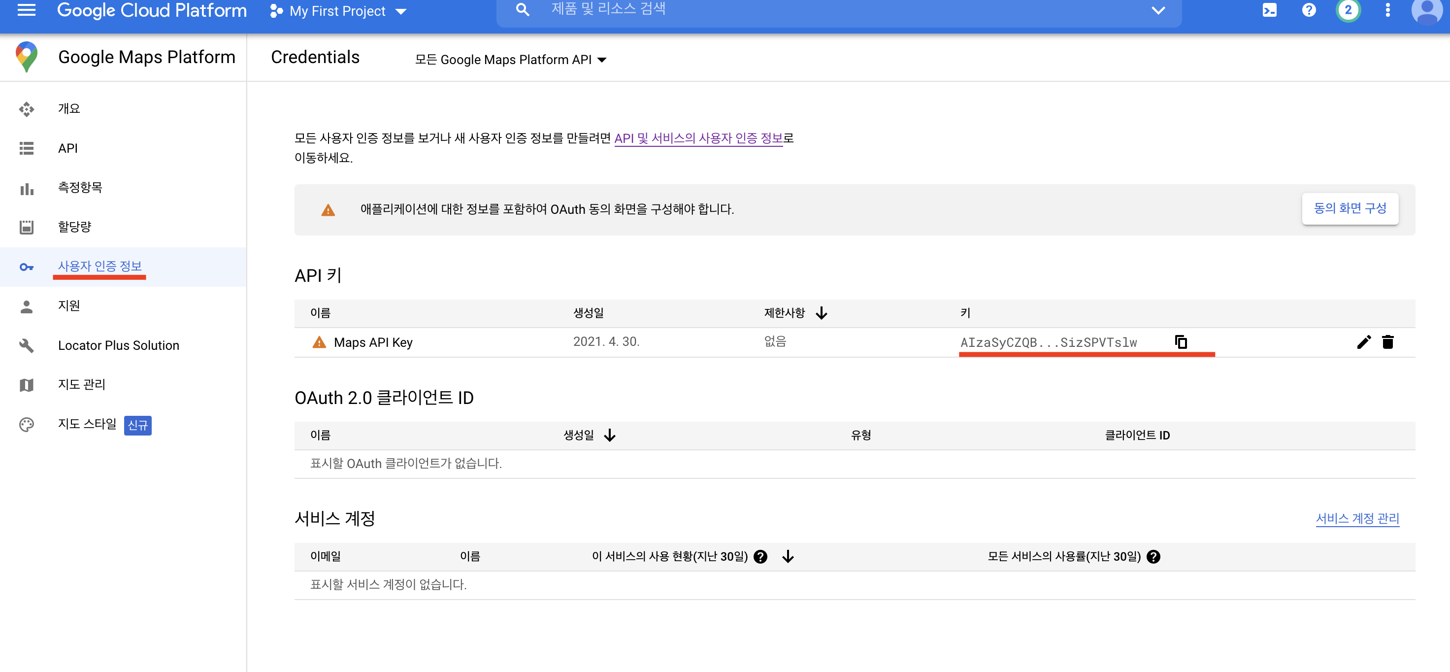 "사용자 인증 정보" 항목을 클릭하면 발급된 키를 확인할 수 있습니다