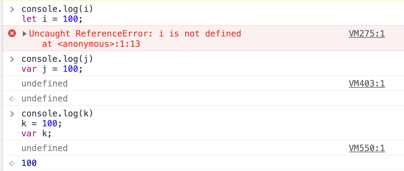 하지만 var은 호이스팅이 발생하면서 undefined 혹은 100을 뱉고 있습니다.